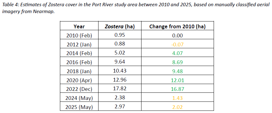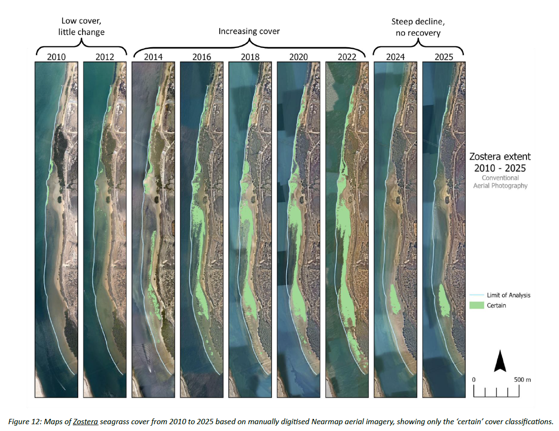 Aerial imagery from 2010 to 2025 revealed three distinct phases in Zostera seagrass cover within the Port River/Yartapuulti study area along the western bank of Torrens Island: